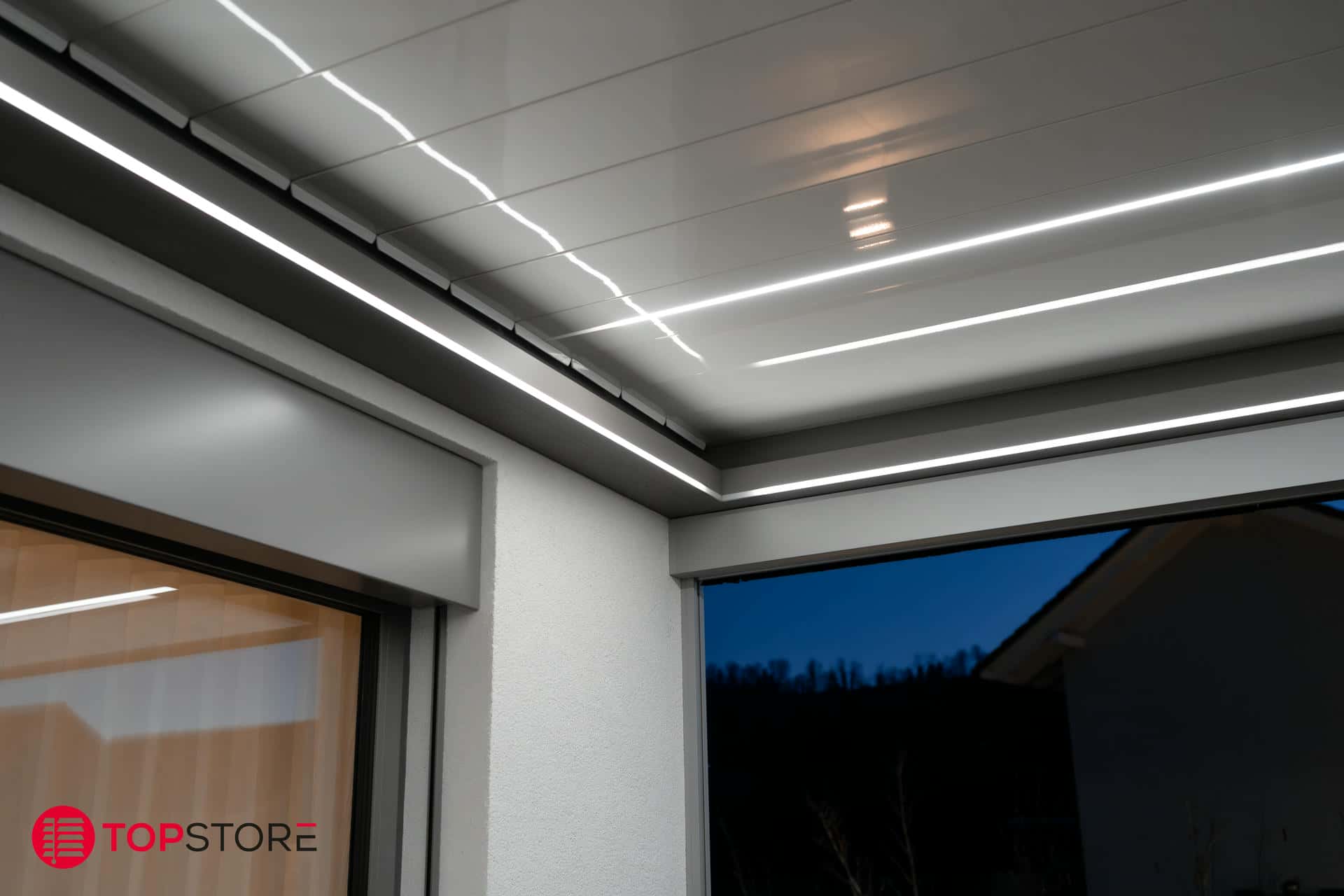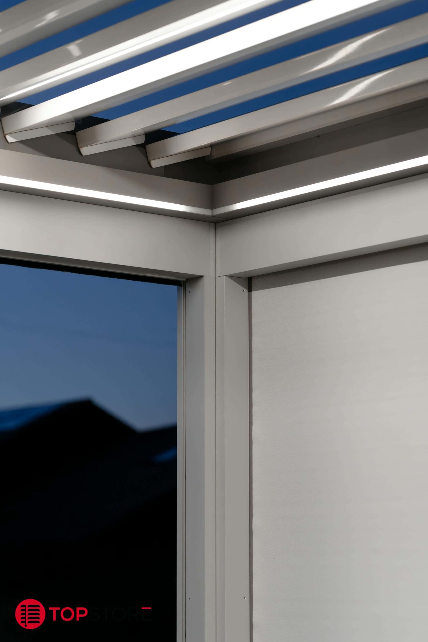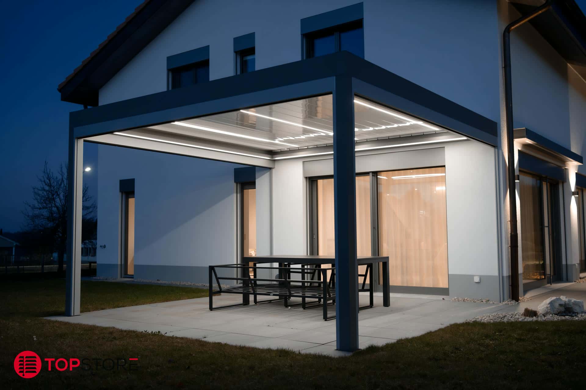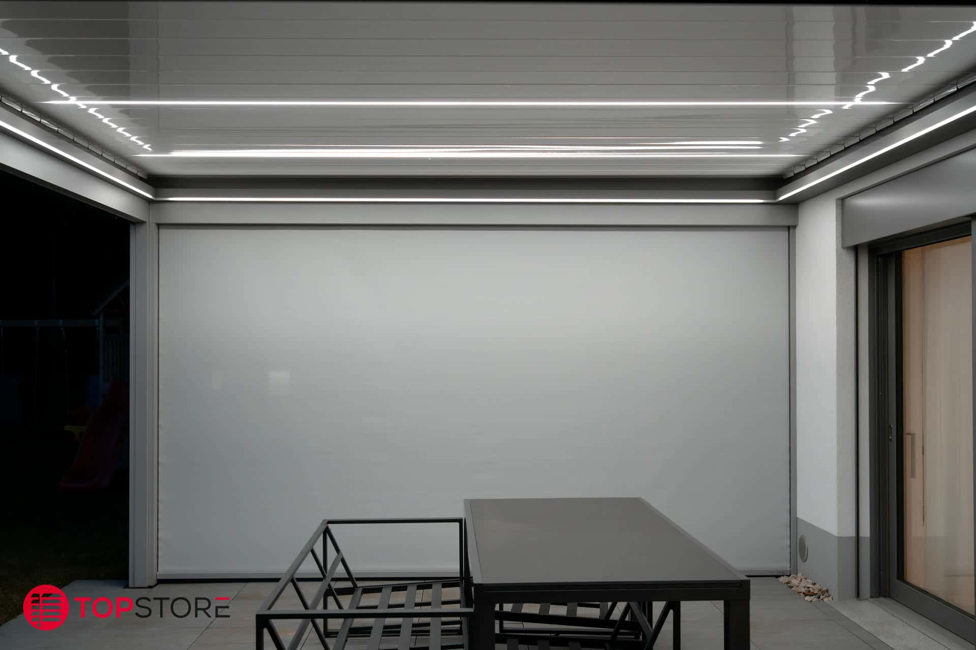 - Options disponibles : éclairage LED, vitrages latéraux, stores verticaux et protections contre le vent pour un confort maximal